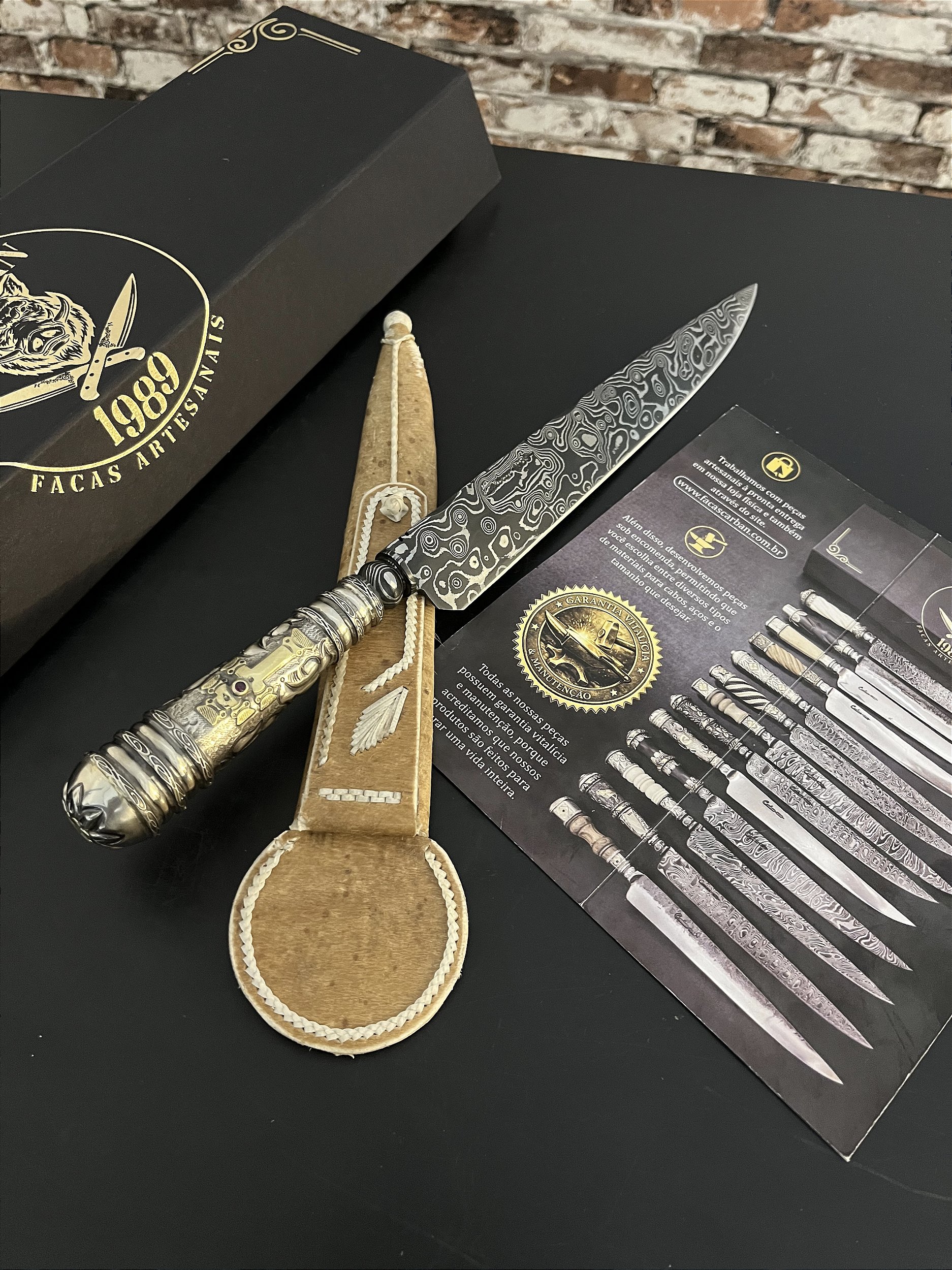 Uma peça que carrega identidade e tradição, com o padrão Raindrop aliado ao simbolismo da cruz missioneira, esculpida manualmente em alpaca. 🔪