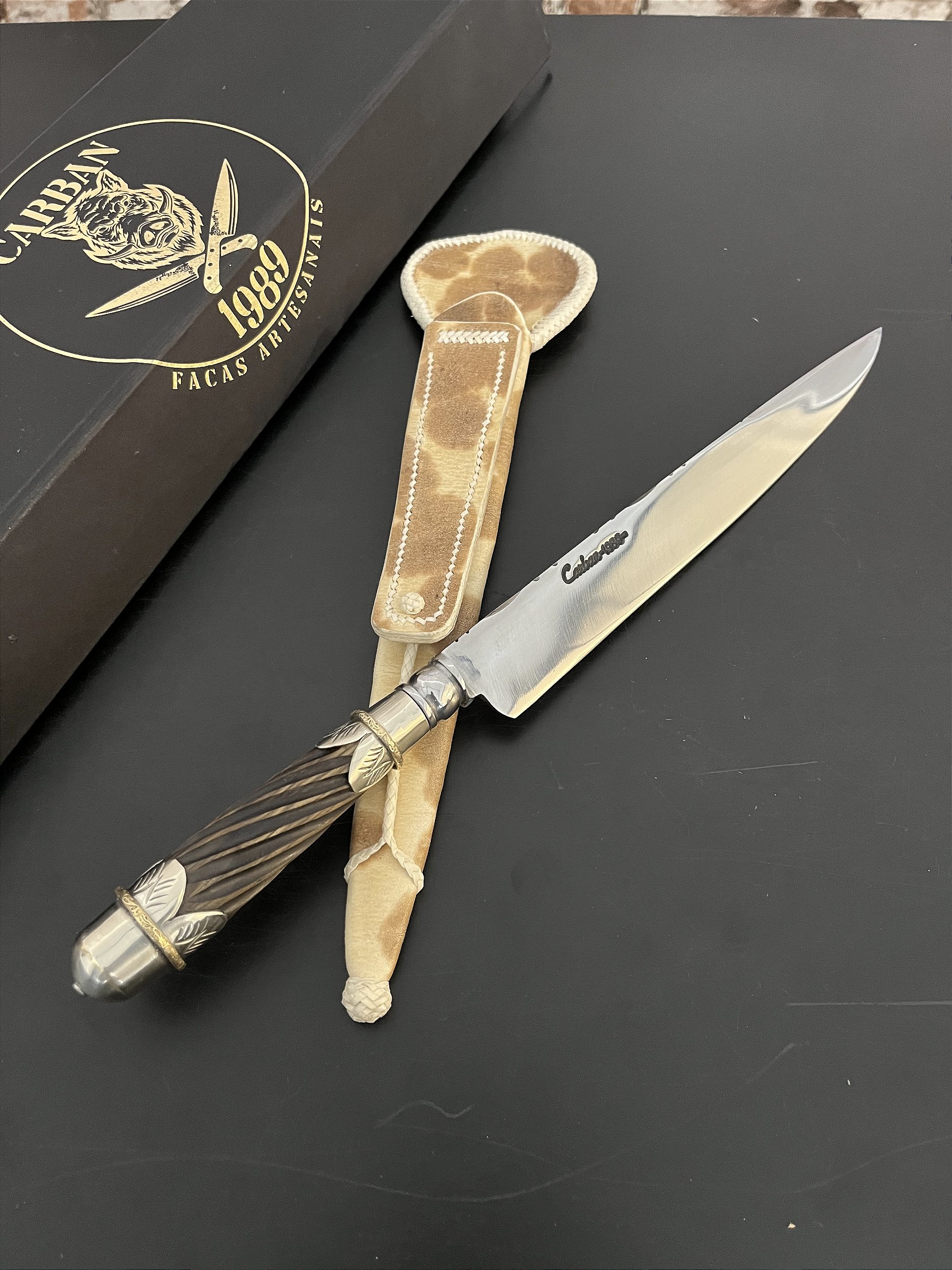 Faca artesanal forjada em aço carbono, produzida a partir de mola de trem, garantindo alta resistência e excelente desempenho no uso. Com dorso mosqueado e cabo em madeira guajuvira com adornos em alpaca, é uma peça que une tradição, funcionalidade e acabamento refinado.