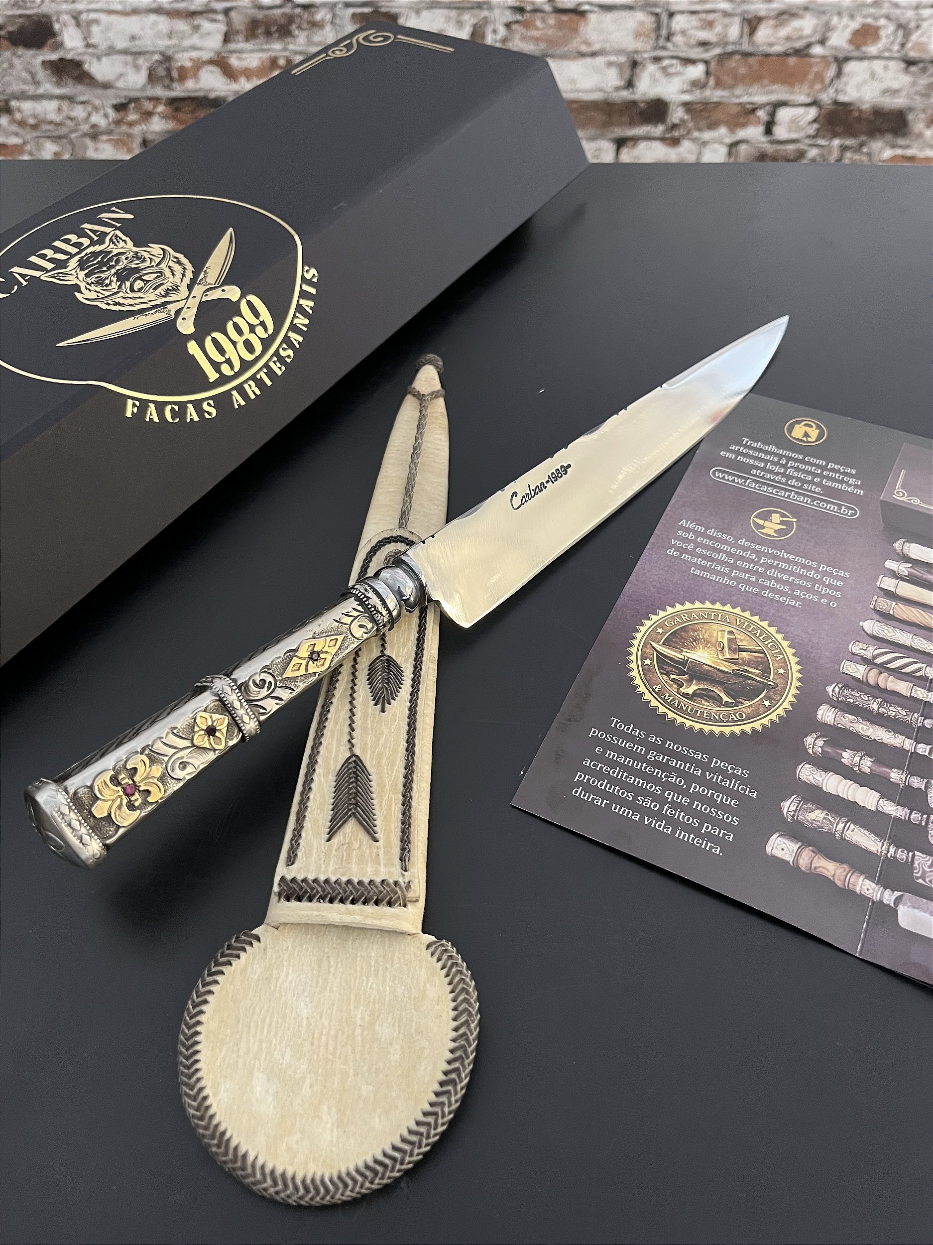 Uma peça que carrega força e história, forjada a partir de mola de trem e finalizada com um cabo esculpido em prata e ouro, unindo resistência e sofisticação em um só conjunto. 🔪