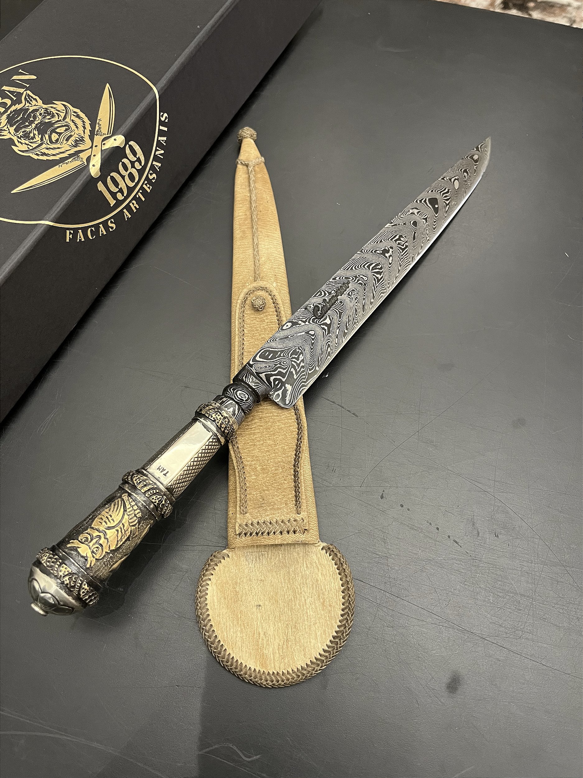 Produzida artesanalmente, esta faca apresenta o padrão Arrowhead, um desenho marcante que valoriza a lâmina e reforça sua exclusividade. Cada detalhe é construído manualmente, do aço ao acabamento do cabo.