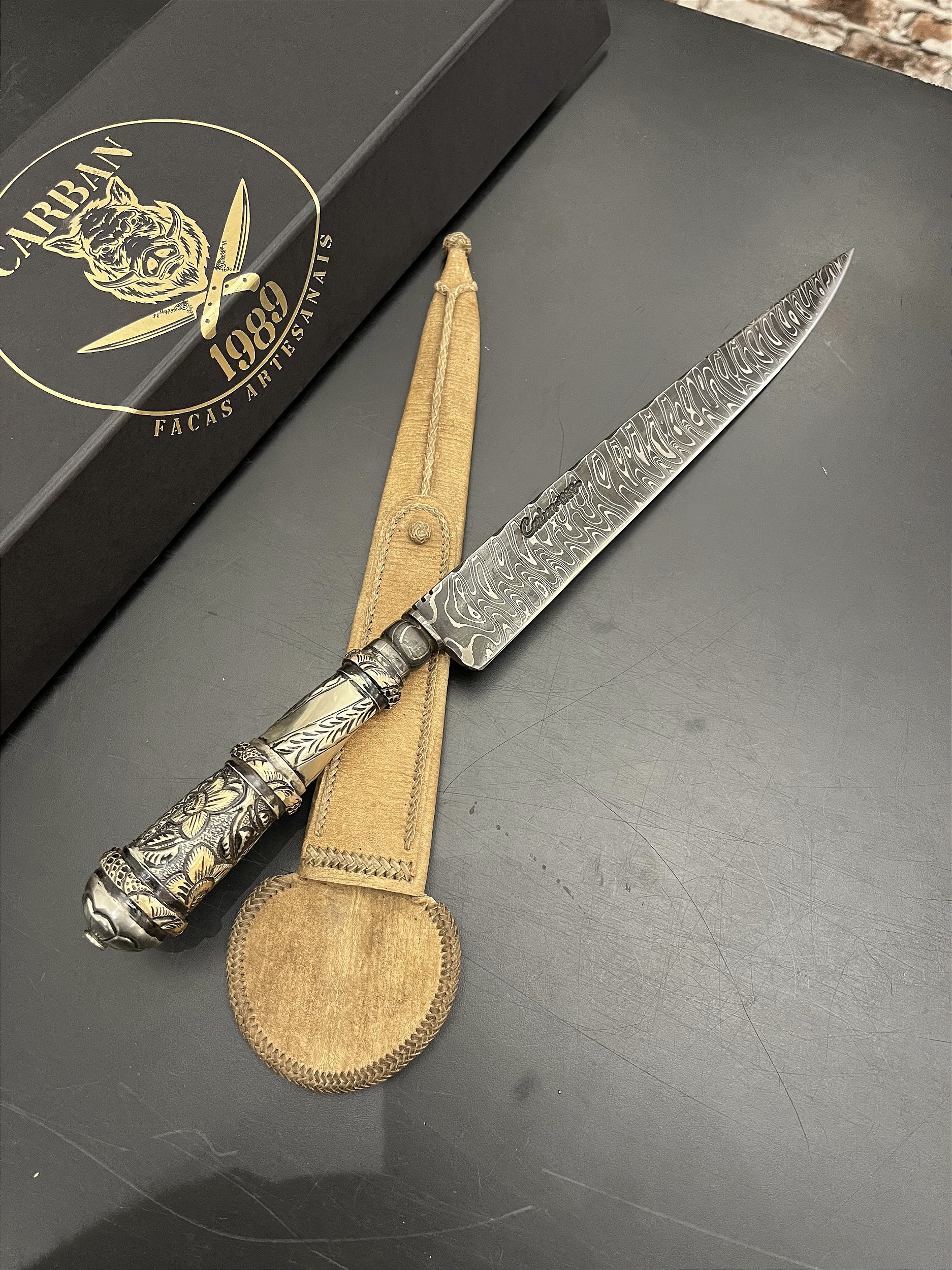 Produzida artesanalmente, esta faca traz o padrão Leader aplicado à lâmina, valorizado pelo dorso mosqueado, que reforça o trabalho manual e a identidade única da peça. Cada detalhe é construído à mão, respeitando técnica, tradição e acabamento de alto padrão.
