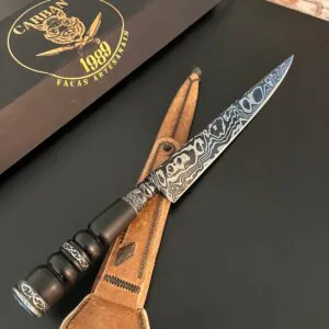 • Cabo em chifre de búfalo torneada com adornos em zamak;