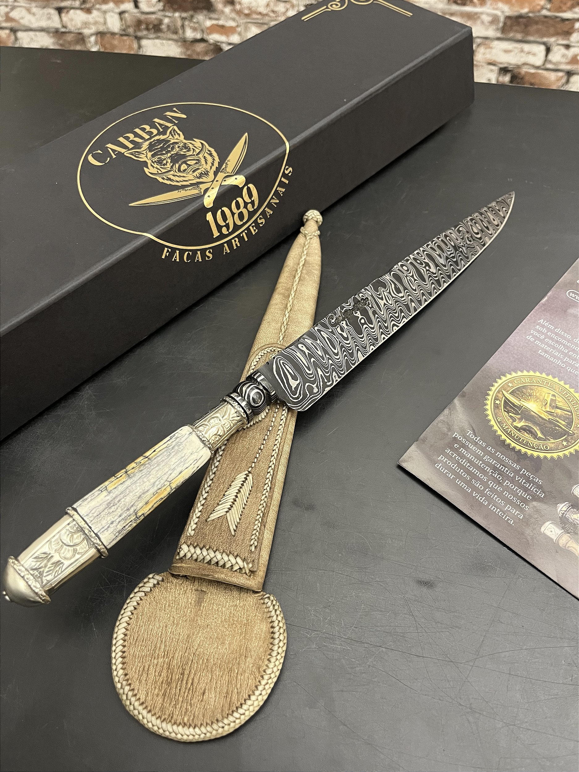 Produzida artesanalmente, esta faca apresenta o padrão Leader aplicado à lâmina de 10 polegadas, enriquecido pelo dorso mosqueado que evidencia o trabalho manual e reforça seu caráter exclusivo. Cada detalhe é construído à mão, respeitando tradição e excelência no acabamento.