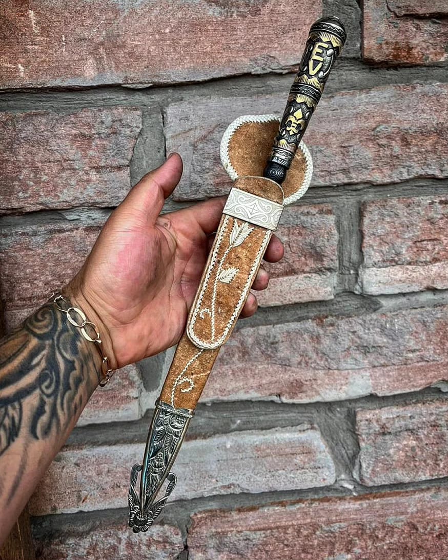 • Bainha em couro cru costurado a mão com lonca caprina, detalhes e ponteira em alpaca;